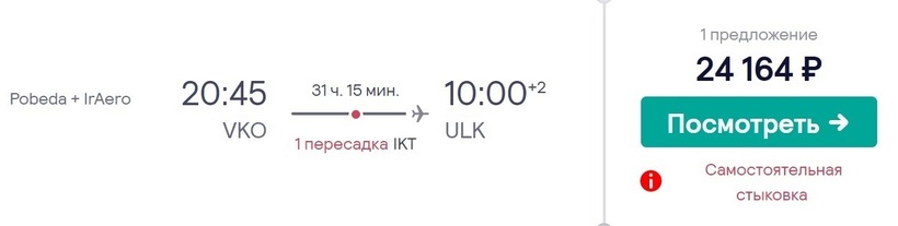 Со стоповером в Иркутске можно долететь до Ленска за сутки и семь часов. Перевозчики — «Победа» и «ИрАэро». Билет за 1,5 месяца до вылета можно купить за 24100 рублей.