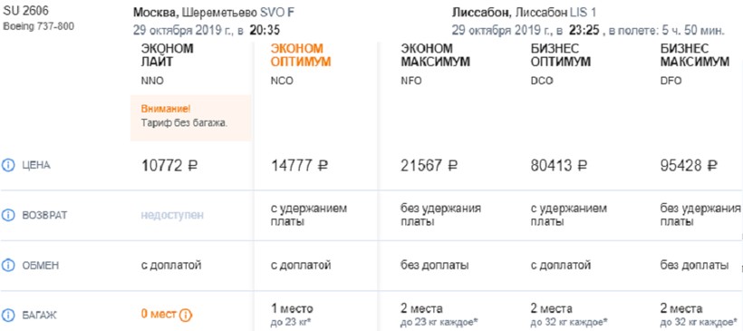 «Аэрофлот». Расписание полетов у российского перевозчика схожее с предыдущим оператором — выполняет по одному утреннему авиарейсу ежедневно. А вот по ценам на билеты компания немного проигрывает. Для путешествий на крыльях «Аэрофлота» я выбираю тариф с багажом «Оптимум» (в экономклассе) — полет только туда стоит от 15000 ₽, в обе стороны — от 25500 ₽. Значительно дороже у российской компании, чем у португальской, бизнес-класс — от 80500 ₽.