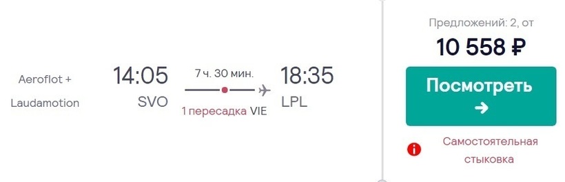 Из столицы РФ в Ливерпуль можно попасть с одной или несколькими пересадками — прямые рейсы отсутствуют. Один из самых быстрых способов добраться до конечного пункта — совершить перелет с российской а/к «Аэрофлот» и с австрийским лоукостером Laudamotion. Общее время в пути — 7,5 часа. Пересадка в Вене — 2 часа. Билеты только туда за пару недель — от 10500 рублей.