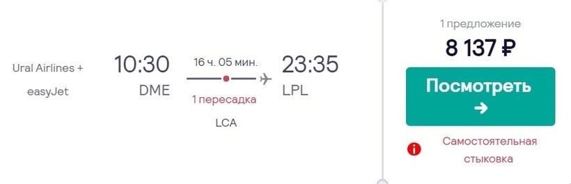 У авиакомпаний нет договоренности о пересадке, стыковка в столице Австрии будет самостоятельной, то есть нужно будет забрать багаж и зарегистрироваться на следующий рейс. Более дешевый вариант, но в то же время более долгий — перелет с «Уральскими авиалиниями» и британским лоукостером easyJet. Билеты за месяц до рейса можно купить за 8150 рублей, обратные обойдутся примерно в такую же сумму.