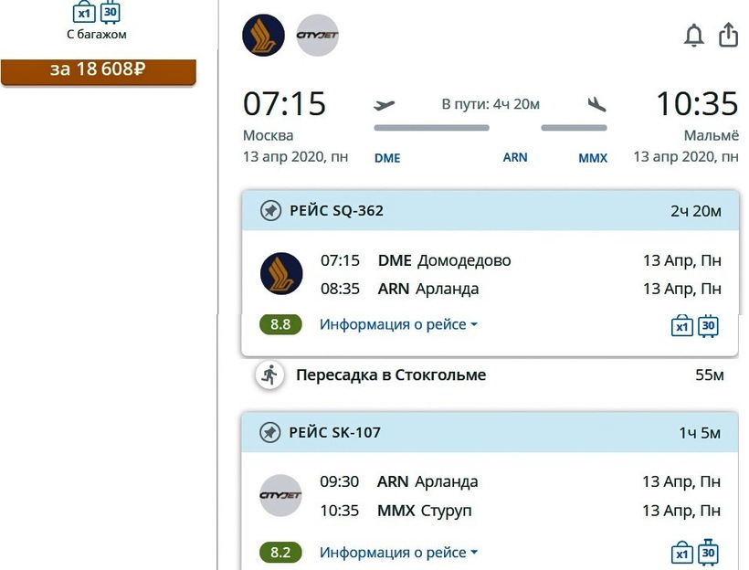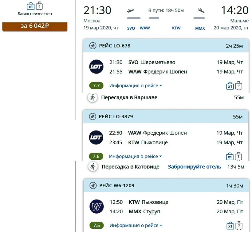 Кроме предложенных вариантов полетов, тем, кто ищет максимально дешевый способ преодоления маршрута, рекомендую рейсы с двумя пересадками. Например, долететь до аэропорта Мальмё-Стуруп можно с компаниями LOT и Wizz Air через Варшаву и Катовице (с пересадками продолжительностью в 1 ч. и 13 ч. соответственно). Займет такое путешествие 19 ч., зато обойдется с ручной кладью всего от 6000 ₽.