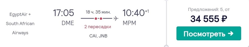 Билеты «туда-обратно» в марте обойдутся вам всего в 79 013 рублей, а в июле придется заплатить за них не менее 109 067 рублей. В среднем же, долететь до Мапуту и вернуться в Москву можно за 90 763 рубля.