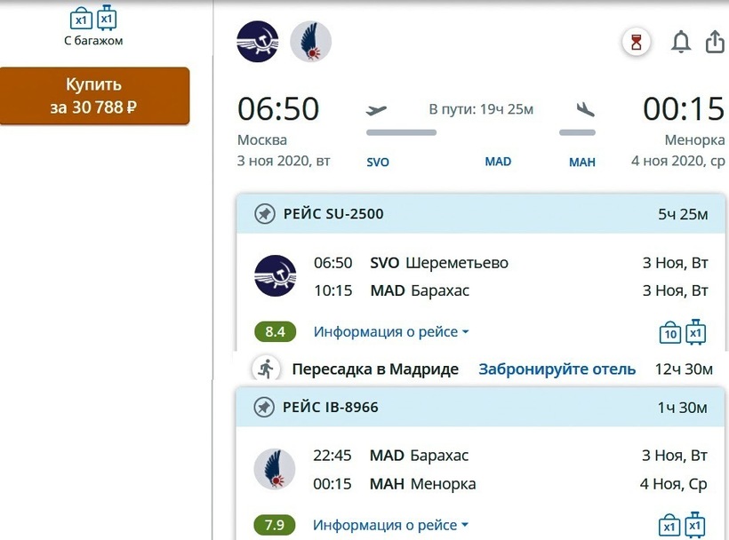 Прямые перелеты между столицей России и испанским островом не совершаются, поэтому преодолевать путь придется с пересадкой. Наиболее развито транзитное авиасообщение в весенне-летнее время (расскажу далее), а лететь на Менорку в осенне-зимний период удобнее всего с «Аэрофлотом» и Iberia (выполняют ежедневные совместные рейсы). С апреля по ноябрь с полуторачасовой пересадкой в Мадриде путешествие занимает 8,5 ч., в остальные месяцы стыковка длится 12,5 ч., а весь полет — 19,5 ч. Во время продолжительной дневной пересадки рекомендую посмотреть такие достопримечательности испанской столицы, как, например, Королевский дворец и дворец Сибелес, а также можно прогуляться по улице Гран-Виа и заглянуть в музей Прадо. Билеты в одну сторону у компаний дорогие — стоят от 30500 ₽. Зато оформить полет туда-обратно можно всего за 33500 ₽. В стоимость включен провоз багажа, тариф с ручной кладью операторы не предлагают. Бизнес-класс — от 138000 ₽.
