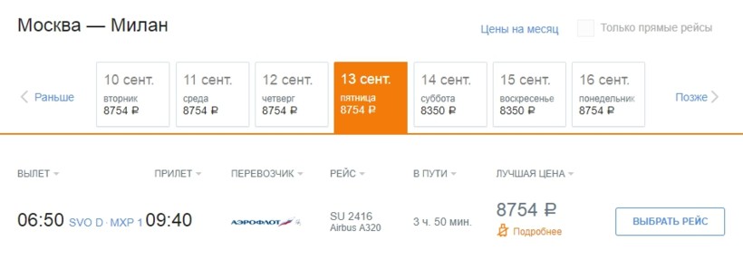 | Аэрофлот (SU 2410) | 08:25 Москва (SVO) | 3 ч. 45 мин | 11:10 Милан (MXP) | вт, пт с 03.05 по 30.09 |