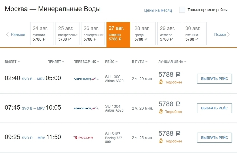 | Аэрофлот (SU 1310) Airbus A321 | 07:35 Москва (SVO) | 3 ч. 35 мин | 11:10 Минеральные воды (MRV) | 26, 28, 29, 30, 31 октября, 1, 2, 5, 6, 7, 8, 9, 11, 12, 13, 14, 15, 16, 18, 19 ноября, … |