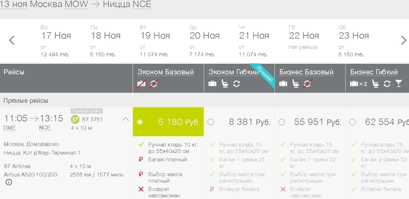 1. S7 Airlines. Пользоваться услугами перевозчика можно круглый год (каждый день в Ниццу летает один самолет), правда, в осенне-зимний период количество доступных рейсов уменьшается — в неделю доступно пять-шесть. Расписание можно найти на сайте авиаоператора. Предлагается несколько тарифных планов, различающихся между собой набором опций, стоимостью.