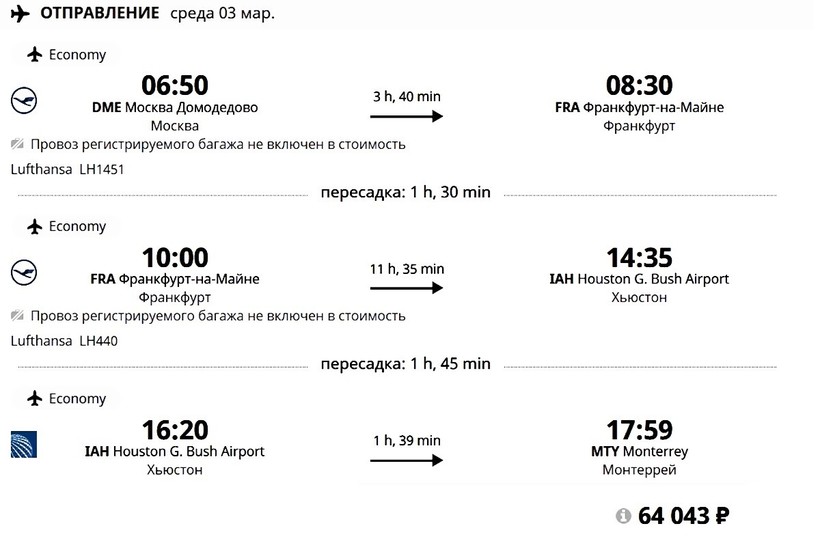 Lufthansa — авиаперевозчик Германии, лайнеры которого совершают транзитный перелет (совместно с американской компанией United Airlines) через Франкфурт-на-Майне и Хьюстон (или Майами). В декабре–феврале полеты выполняются раз в неделю, а с марта 2021 года запланированы ежедневные рейсы. Расписание у немецкой компании насыщенное — в сутки по данному маршруту летит до 15 самолетов (вылет из Домодедово). Тарифы для экономкласса следующие: