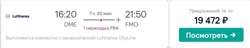 Начну с того, что добраться до Мюнстера можно только стыковочными рейсами — прямого авиасообщения между городами нет. Флагманский перевозчик Германии — Lufthansa совместно со своей дочерней а/к Lufthansa CityLine предлагают добраться до конечного пункта за семь с половиной часов. Из этого времени (в аэропорту Франкфурта-на-Майне) на стыковку уйдет 3 часа. Стоимость билетов только туда за пару недель — от 19400 рублей. Авиакомпания предлагает как бизнес, так и экономкласс.