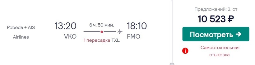 В итоге, оптимальным вариантом для перелета по времени в дороге и стоимости билетов, который я выбрала — совместный рейс «Победа» и AIS Airlines. Напомню, что в дороге нужно провести 7 часов, а билеты можно купить за 10500 рублей. Вдобавок у перевозчиков вполне удобное расписание: вылет из Москвы в обед, прибытие в Мюнстер не поздно вечером (по местному времени). Это дает возможность преодолеть путь до, а потом и из аэропорта на общественном транспорте и не тратиться на такси.