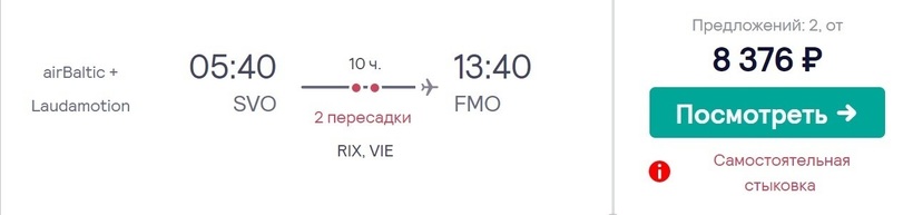 Пересадка в аэропорту Берлин-Тегель. По времени она займет около трех часов. Причем у авиаоператоров нет договоренности о стыковке, и она будет самостоятельной, то есть выбрав этот вариант, единого билета не будет. В Берлине нужно получить и заново сдать багаж, зарегистрироваться на рейс до Мюнстера, пройти процедуры паспортного и таможенного контроля. Времени на это будет достаточно. Потратите на дорогу десять часов. Билет можно купить за 8300 рублей (за месяц). Правда, придется сделать две пересадки, что не совсем удобно. Первая стыковка в Риге — 1 ч., вторая в Вене — 3,5 ч. Перевозчики: латвийская национальная компания airBaltic и австрийский лоукостер Laudamotion.