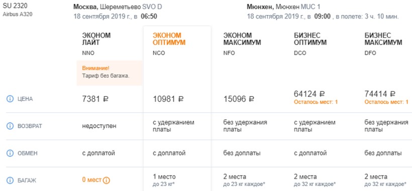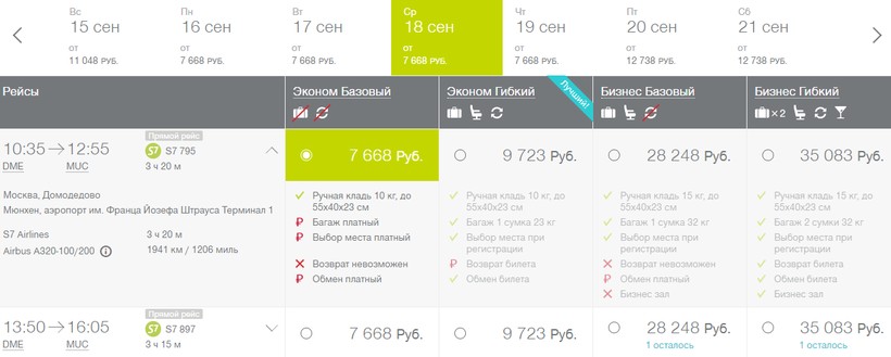 Крупнейший немецкий авиаперевозчик выполняет ежедневно по маршруту по три прямых рейса в разное время дня. И хотя полеты на ближайшие даты с ним дороже, чем с упомянутыми российскими компаниями, я часто выбираю авиапутешествия именно с Lufthansa, потому что за 1 месяц и более до вылета купить у перевозчика билеты в одну сторону с багажом можно всего за 8000 ₽, туда-обратно — от 12000 ₽. Полет в бизнес-классе — от 27000 ₽.