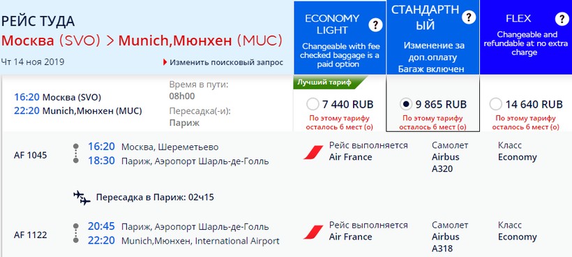 Air France через Париж. Восьмичасовое путешествие (2 ч. пересадки) будет стоить от 10000 ₽ с багажом.