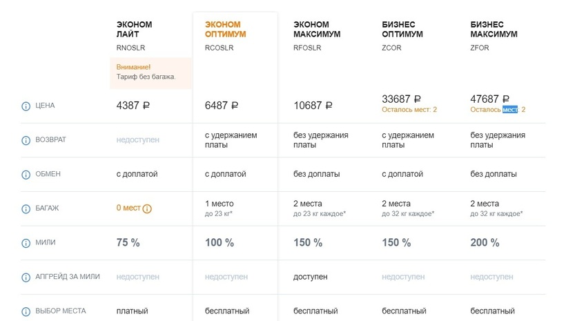 Что касается бизнес-класса, то цены стартуют с 34 тысяч руб., также за пару недель до отбытия самолета. Есть два тарифа, которые различаются набором опций.
