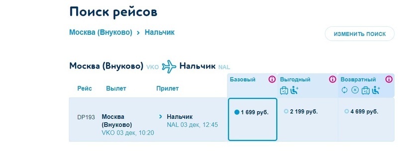 | Победа (DP 6901) Boeing 737-800 | 15:00 Москва (SVO) | 3 ч. 10 мин | 18:10 Нальчик (NAL) | 20 октября |