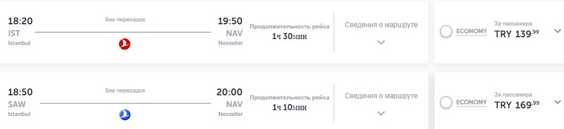 Стыковка в аэропорту имени Сабихи Гёкчен, она самостоятельная, ее продолжительность составляет от 2 часов 45 минут до почти 5 часов. Вылет в Невшехир вечерний. Если я летаю с лоукостерами, то билеты приобретаю заблаговременно, за месяц или за полтора до поездки. Например, полет из Москвы в Невшехир будет стоить приблизительно 7000 рублей за 30 дней до вылета.