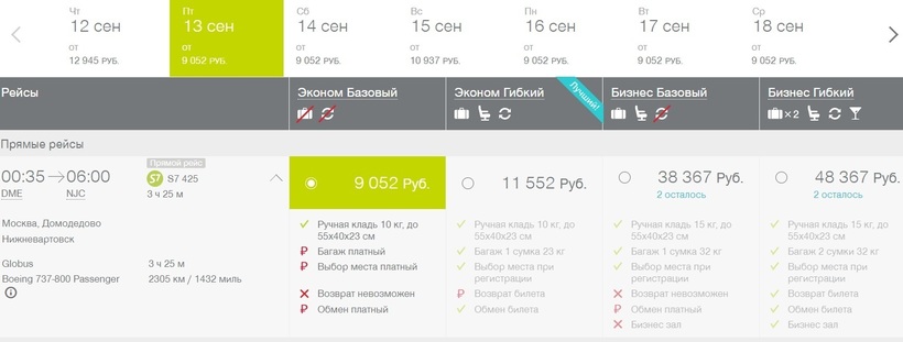 У первого перевозчика билеты за неделю до вылета — от 10000 рублей (минимальная цена). Есть 3 авиатарифа в экономкласс: