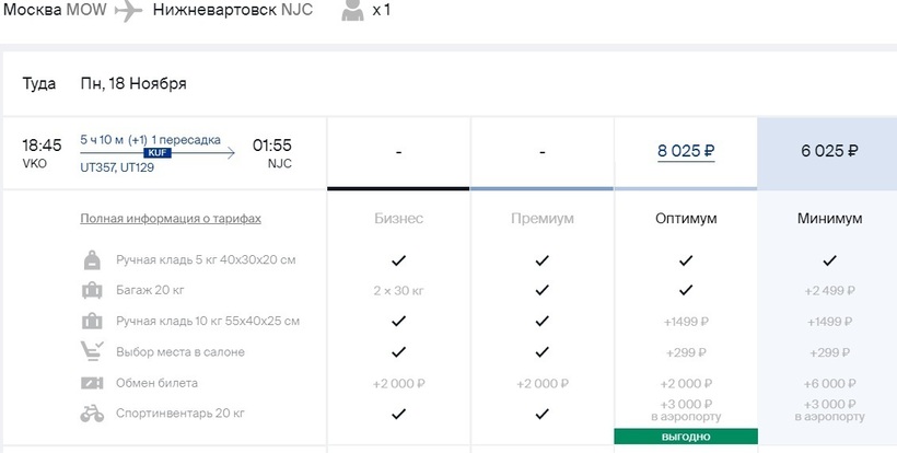 «Максимум». Подойдет для тех, кто не уверен, что точно полетит в Нижневартовск в определенный день — авиабилет возвратный и без удержания платы. Плюс в багаж можно сдать два чемодана (вес каждого не должен превышать 23 кг).