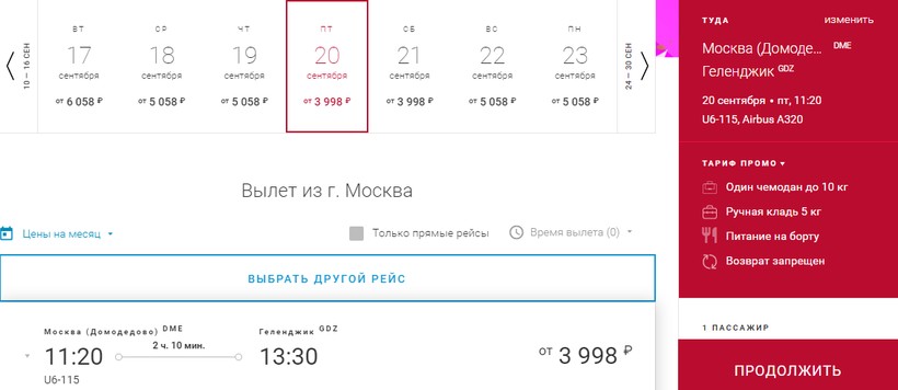 «Победа». Лоукостер совершает сезонные авиарейсы до Геленджика и Витязево. Перелет с ним советую тем, кто привык путешествовать налегке, ведь билеты с ручной кладью на некоторые даты можно купить всего за 2600–4600 ₽ (в обе стороны от 8000 ₽).