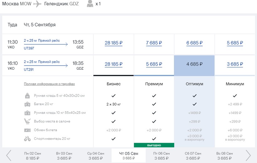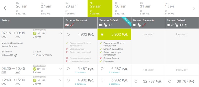 Указанные мной цены действуют на ближайшие даты и при покупке билетов за 2 месяца до вылета, а вот при бронировании их за 2,5–6 месяцев авиапутешествие будет стоить от 8000 ₽ только туда (по тарифу «Гибкий»). И чтобы сэкономить, можно покупать авиабилеты опять же только с ручной кладью.