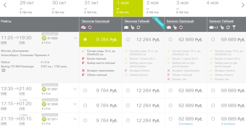| S7 Airlines (S7 2505) Boeing 737-800 | 11:20 Москва (DME) | 4 ч. 10 мин | 19:30 Новосибирск (OVB) | 12 ноября |