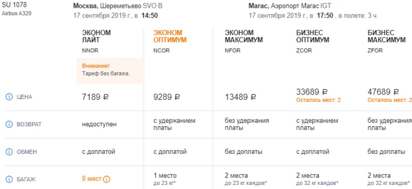 «Аэрофлот». Крупнейший российский авиаперевозчик выполняет каждый день по маршруту всего по одному вылету в дневное время. По стоимости полеты с «Аэрофлотом» не дешевые. Я обычно для перелета в экономклассе выбираю тариф «Оптимум», потому что он включает багаж, а также авиабилеты при необходимости можно вернуть или внести в них изменения (правда, со штрафом). Путешествие только туда (как на ближайшие даты, так и за 10 месяцев до вылета) обходится в 9300 ₽, в обе стороны — от 15000 ₽. Полет в бизнес-классе — от 33700 ₽.