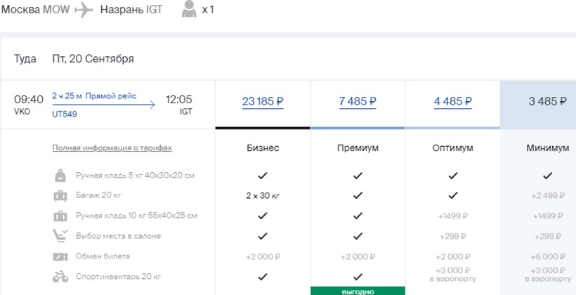 Тем, кто привык путешествовать в максимально комфортных условиях, также рекомендую выбирать полет на крыльях «ЮТэйр», потому что авиабилеты в бизнес-класс у него дешевле аэрофлотовских примерно на 10000 ₽ (напомню, 23200 ₽ против 33700 ₽).