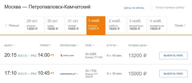 Россия (FV 6367) Boeing 777-300ER | 20:15 Москва (SVO) | 8 ч. 30 мин | 13:45 Петропавловск-Камчатский (PKC) | 1 ноября |