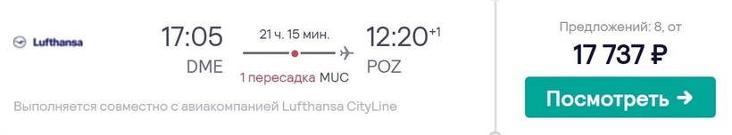 Один из самых быстрых способов добраться до аэропорта, которым я пользуюсь чаще всего — совершить поездку на аэроэкспрессе. Отбывает транспорт от Белорусского вокзала. Электропоезда ходят строго по расписанию с 05:30 до 00:30. Интервал движения — 30 минут. Выгоднее сразу брать билеты туда-обратно. Также перелеты до Познани предлагает флагманский перевозчик Германии — а/к Lufthansa. Рейсы выполняются совместно с Lufthansa CityLine. Длительность авиапутешествия — от 7 до 21 часа. Стыковки в Мюнхене (аэропорт имени Франца-Йозефа Штрауса) или во Франкфурте-на-Майне (авиаузел известен как Рейн-Майнский аэропорт). Авиабилеты за полтора месяца — от 17700 рублей.
