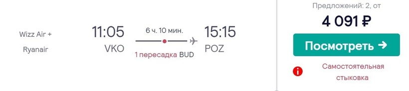 Дорога займет 6 часов. Стыковка (самостоятельная) в Будапеште — 2 часа (аэропорт имени Ференца Листа). Отправление из Внуково (до воздушной гавани ходят аэроэкспрессы от Киевского вокзала). Также Wizz Air UK летает в Познань через Лондон. Билеты немного дешевле — от 3500 рублей (за 1,5 месяца). Правда, вариант не особо удобный, потому что в дороге нужно провести почти сутки, на пересадку в аэропорту Лутон потратить 15 ч. (без транзитной визы покидать воздушную гавань нельзя).