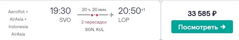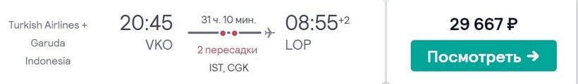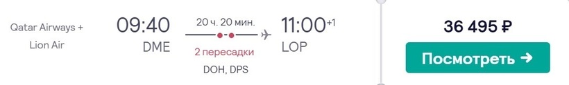 За такое же время есть возможность долететь до Ломбока на лайнерах Qatar Airways, Lion Air. На стыковки в Дохе и Денпасаре уйдет 5 часов. Самостоятельная стыковка будет только одна — в аэропорту столицы острова Бали. Цены на билеты за месяц стартуют с 36500 рублей.