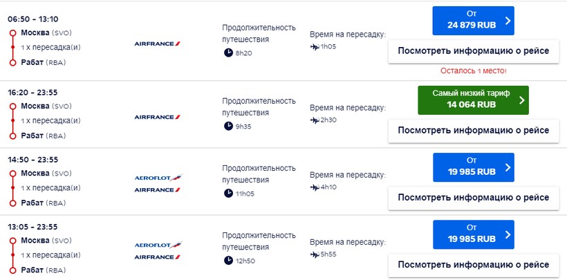 Если вам необходимо добраться до Рабата как можно быстрее, при этом вы хотите лететь со всеми удобствами, то лучше, конечно, воспользоваться услугами Air France. Она предлагает своим клиентам разнообразный график рейсов, к тому же у нее куда лучше условия — предусмотрено питание, лайнеры более комфортабельные, нет самостоятельной пересадки.