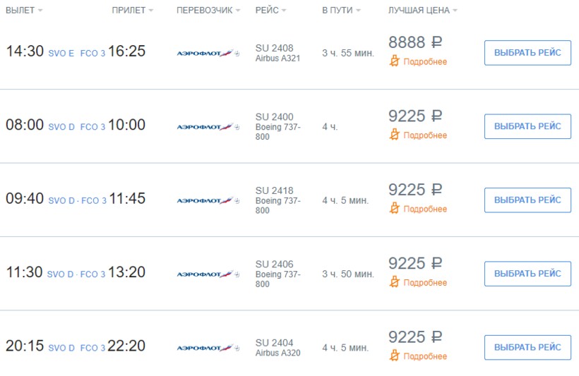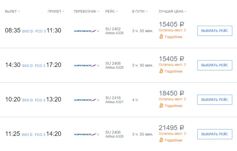 Итальянский перевозчик Alitalia летает из Шереметьево в Фьюмичино несколько раз в день. Обратите внимание на то, что часть рейсов осуществляет «Аэрофлот». Билеты лучше приобретать заранее, за месяц до перелета, тогда их цена составит от 9000 рублей. Это тариф, где бесплатно можно взять только ручную кладь. За тариф с багажом нужно будет доплатить 1000 рублей. Покупка билетов за пару дней до вылета обойдется дороже в несколько раз. У S7 Airlines есть один утренний вылет из Домодедово.