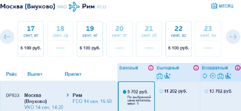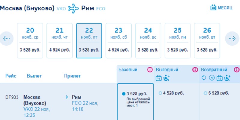 Самолеты Ural Airlines совершают прямые полеты до Рима из аэропорта Жуковский. Вылет происходит раз в сутки в утреннее время, но рейс не ежедневный, а только 3–4 раза в неделю. С ноября отсутствуют рейсы по вторникам и четвергам. Цена на перелеты относительно стабильна, колеблется в пределах 4–5 тысяч рублей и не зависит от времени покупки. Это стоимость самого дешевого тарифа, куда включена только ручная кладь.