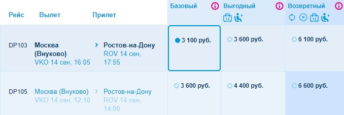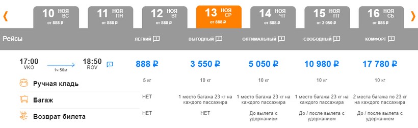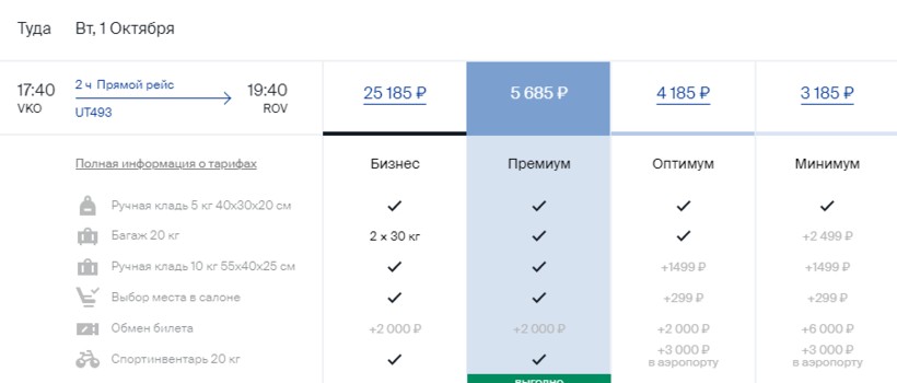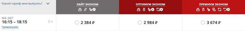 Это цена тарифа «Базовый», где из удобств только бесплатная ручная кладь. Всегда, когда у меня есть багаж, я доплачиваю до тарифа «Выгодный», разница между ними 500 рублей, а отдельно купить багажное место стоит 800–1500 рублей (зависит от веса). «Возвратный» тариф советую брать в тех случаях, когда вы не уверены в дате поездки, и вам нужна возможность обменять билет или вернуть его.