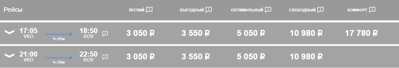 | Аэрофлот (SU 1160) Airbus A321 | 17:20 Москва (SVO) | 2 ч. 00 мин | 19:20 Ростов-на-Дону (ROV) | ежедневно с 01.04 по 29.08 |