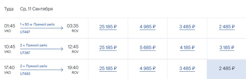 | ЮТэйр (UT 367) Boeing 737-800 | 12:10 Москва (VKO) | 2 ч. 00 мин | 14:10 Ростов-на-Дону (ROV) | ежедневно с 01.06 по 29.10 |