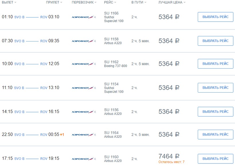 | Аэрофлот (SU 1162) Airbus A320 | 09:00 Москва (SVO) | 2 ч. 00 мин | 11:00 Ростов-на-Дону (ROV) | ежедневно с 01.04 по 29.08 |