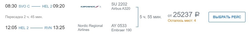 Регулярные рейсы по маршруту Москва — Хельсинки — Рованиеми выполняет ведущий российский авиаоператор «Аэрофлот» и финские авиакомпании Nordic Regional Airlines, Finnair. Они доступны 6–7 раз в неделю, есть от 3 до 7 вариантов перелетов различной продолжительности (от 4,5 ч. до суток, включая стыковку в аэропорту Вантаа). Между авиаперевозчиками заключено код-шеринговое соглашение, так что, полетите по единому билету. Теперь про стоимость авиабилетов. Она стабильна, как за месяц, так и за полгода до отправления самолетов составляет минимум 25200 рублей. Если говорить о новогодних праздниках, то ожидать распродаж нет смысла. Это один из самых загруженных периодов, и если планируете посетить Рованиеми в такие дни, советую бронировать билеты за полгода вперед, чтобы иметь возможность купить их по минимальным ценам. За 25200 рублей полетите в экономе, с собой можно взять багаж и ручную кладь, выбрать бесплатно место в салоне самолета.