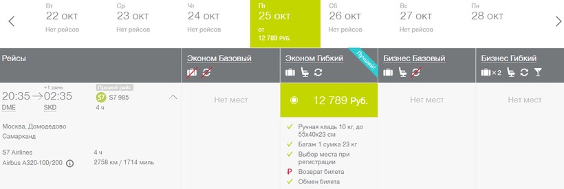 Аэрофлот (SU 1984) Airbus A320 | 23:40 Москва (SVO) | 4 ч. 20 мин | 06:00 Самарканд (SKD) | ежедневно, кроме вс по 25.10 |