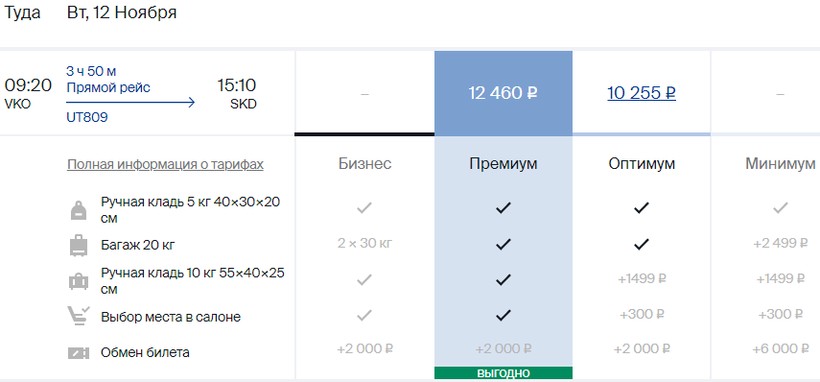 Utair. За 2 месяца до вылета стоимость билета от 10250 рублей. Компания предлагает два тарифа в экономкласс — «Оптимум» и «Премиум». По условиям первого вы можете взять с собой ручную кладь (1 место до 5 кг), плюс сдать в багаж 1 чемодан (до 20 кг). Выбор места осуществляется за дополнительную плату. По условиям второго тарифа (он дороже примерно на 2000 рублей) в салон самолета можно взять 2 сумки ручной клади (вес одной до 5 кг, а второй до 10 кг). Багаж — 1 чемодан до 20 кг.