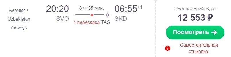 Альтернативой прямому рейсу может служить стыковочный рейс. Такой вариант актуален, если вы заранее не успели купить билет и остался только дорогой бизнес-класс (вдобавок, еще не во все дни есть прямые перелеты). Тогда для многих будет лучше сэкономить и выбрать рейс со стыковкой, потратив больше времени (от 8,5 часа в дороге вместо 4 часов) на воздушное путешествие до Самарканда. Один из самых удобных вариантов полететь через Ташкент вместе с «Аэрофлотом» и Uzbekistan Airways. Общее время в пути — 8 часов 35 минут. Время на пересадку в аэропорту — 3,5 часа. Данный вариант подразумевает самостоятельную стыковку (возможно, вам придется пройти регистрацию на каждый рейс по отдельности). Авиабилет за два месяца до вылета можно приобрести за 12500 рублей.