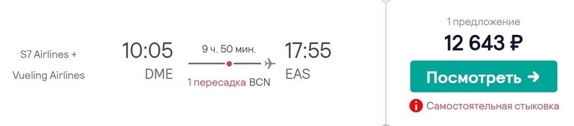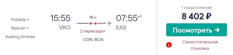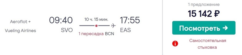 Если выберете этот вариант перелета, то предстоит самостоятельная стыковка, потому что авиакомпании не имеют между собой соглашение о пересадке: понадобится забрать багаж и зарегистрироваться на следующий рейс до Сан-Себастьяна. Времени на это будет достаточно. Также быстро (в дороге — 10 ч.), но за большие деньги (билеты — от 15100 рублей за два месяца до полета) можно добраться с «Аэрофлотом» и Vueling Airlines. Пересадка также в Барселоне — около 4,5 ч.