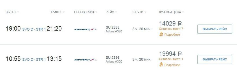 Время первого вылета — 11 часов дня, второго — 19 часов вечера. Цена перелета составляет примерно 14000 рублей.