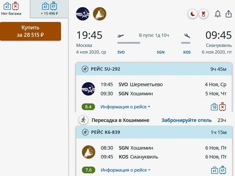 Между столицей России и камбоджийским курортом прямые перелеты не осуществляются. Транзитное сообщение по маршруту также не могу назвать удобным, потому что преодолеть путь с одной пересадкой можно только с компаниями «Аэрофлот» и Cambodia Angkor Air. В ноябре–марте рейсы выполняются трижды в неделю — по средам, пятницам и воскресеньям. В весенне-летнее время самолеты летают по средам и воскресеньям. Путешествие получается довольно длительным — с пересадкой в 23 ч. в Хошимине занимает 34 ч. Придется потратиться на проживание в отеле в Хошимине, но также можно и увидеть основные достопримечательности этого вьетнамского города: например, собор Нотр-Дам, музей «Тоннели Кути», храм Ба Тхиен Хау и пр. Полет с данными авиакомпаниями не из дешевых: туда стоит с багажом от 44000 ₽ (с ручной кладью — от 28500 ₽), в обе стороны — от 56500 ₽. Бизнес-класс — от 173000 ₽.