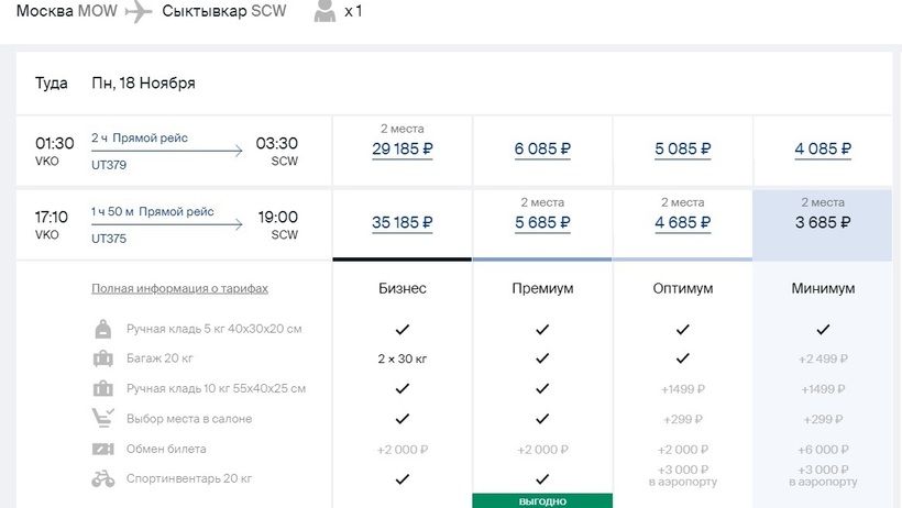 UTair выполняет два ежедневных рейса. Авиабилеты за 2,5 месяца до вылета — от 3650 рублей. На эти вылеты есть 3 тарифа в экономкласс: