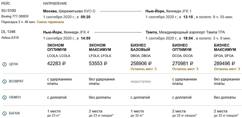 «Аэрофлот» и Delta выполняют каждый день минимум по два авиарейса через Нью-Йорк. С пересадкой в 2,5–3,5 часа путешествие займет 15,5–16,5 ч. Перелет с данными компаниями дорогой — только туда обойдется от 42000 ₽. Рекомендую покупать билеты сразу и в обратную сторону — это обойдется от 52500 ₽. Эти цены уже включают багаж до 23 кг, а полет с ручной кладью операторы не предлагают. К плюсам могу отнести то, что минимальный тариф (для данного направления) изменяемый и возвратный. Стоимость путешествия в бизнес-классе составляет от 259000 ₽.