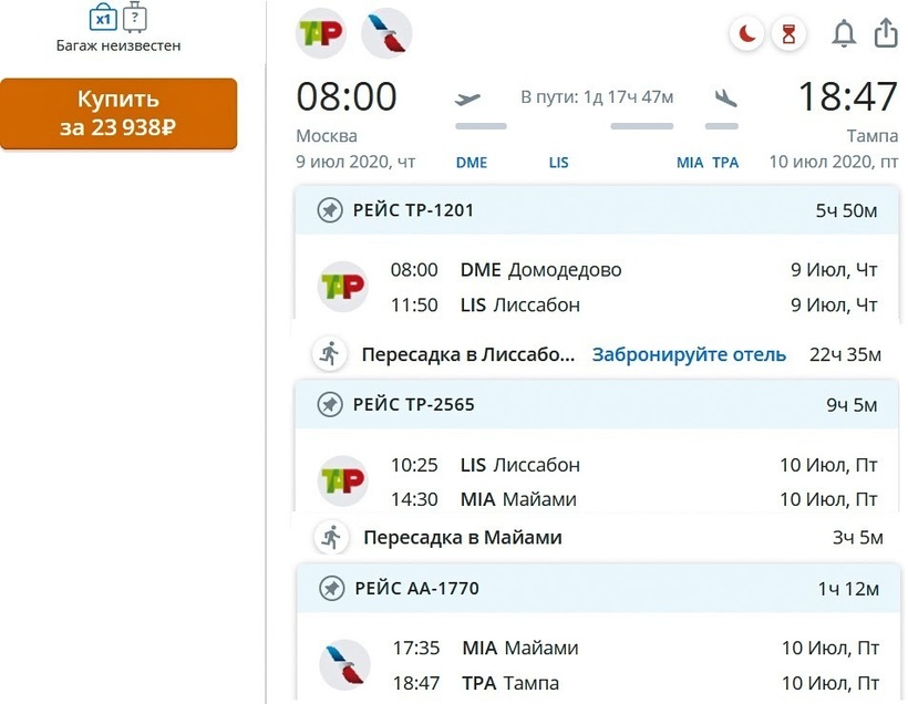 Между российской столицей и Тампой прямое авиасообщение не налажено. Преодолеть довольно большое расстояние между городами можно только транзитными рейсами, с одной непродолжительной стыковкой перелеты предлагают следующие операторы: