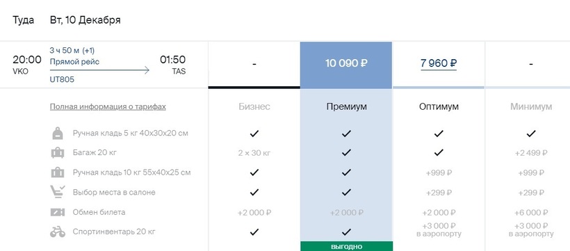 Utair. Самый выгодный тариф у авиакомпании — «Оптимум». Например, за пять месяцев до вылета билет можно купить минимум за 8000 рублей. Сможете взять с собой 5 килограммов ручной клади и чемодан весом до 20 килограммов. Выбор места — платно. Есть и тариф «Премиум» (от 10000 рублей).
