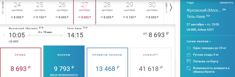 Национальный израильский авиаперевозчик выполняет по маршруту по одному-два прямых рейса во все дни недели, кроме субботы. Я редко выбираю полеты с этой компанией, ведь чаще всего они дороже, чем с упомянутыми российскими перевозчиками: за 2 месяца и более до вылета купить у El Al билеты в одну сторону с багажом можно за 12500 ₽, туда-обратно — от 24000 ₽. А на ближайшие вылеты цена только туда может доходить до 27000 ₽. Также стоимость у El Al (как и у российских авиакомпаний) увеличивается на пиковые даты полетов, примерно на 2000–4000 ₽ (в одну сторону). Путешествие в бизнес-классе — от 57000 ₽.