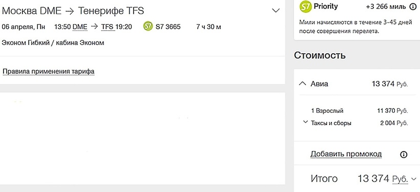 Самолеты «Аэрофлота» летают на Тенерифе 4 раза в неделю, обычно 2 вылета приходятся на выходные (они дороже), а 2 — на будни. Я просматривала цены билетов по данному маршруту почти на год вперед. Мой вывод: стоимость полета с «Аэрофлотом» от сезона не зависит. Самый дешевый авиабилет стоит от 15000 ₽ (тариф «Эконом Лайт», только одна ручная кладь до 10 кг), а по тарифу «Эконом Оптимум» (с багажом весом до 23 кг) вы заплатите от 19500 ₽ (при заказе за 1,5 месяца до полета).